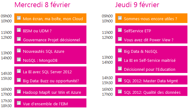 Cette année les incontournables seront pour moi « BISM ou UDM » et « SelfService ETP » (alias Data Explorer), ok c’est biaisé puisque c’est animé par mes compères, respectivement Aurélien Koppel et François Jehl pour SSAS et Jean-Pierre Riehl pour les poneys.